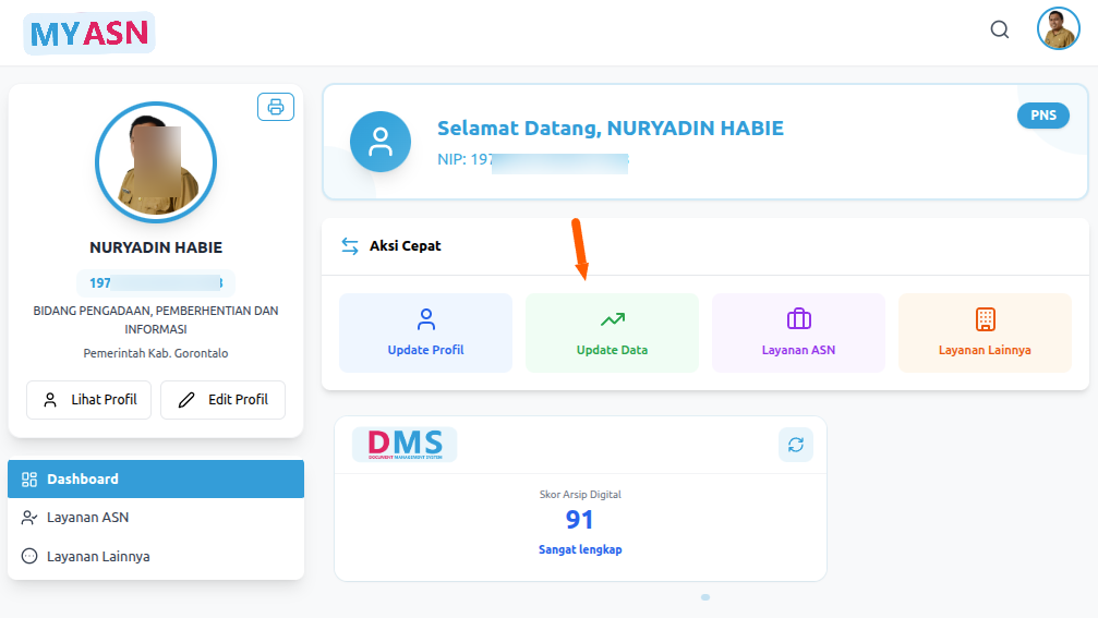Klik pada menu update data untuk membuka dashboard update riwayat