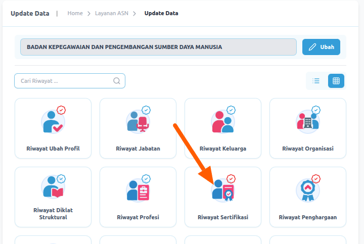 Berikutnya anda akan diarahkan masuk ke Dashboard MyASN, pada tahun 2026 ini untuk upload sertifikat kursus tidak melalui menu DIklat tapi melalui menu riwayat sertifikasi, ikuti petunjuk gambar untuk membuka menu update data riwayat sertifikasi