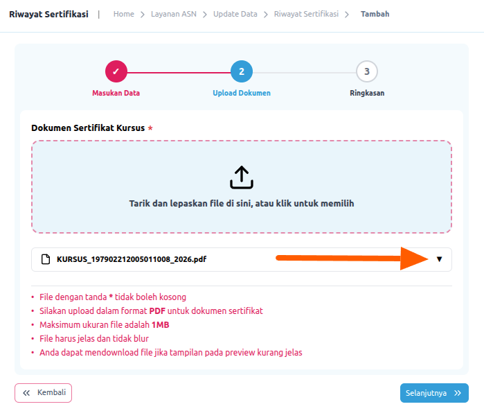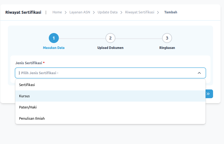 Pilih Kursus jika yang akan di unggah adalah sertifikat Diklat teknis, Diklat Fungsional, Webinar, dan lain-lain