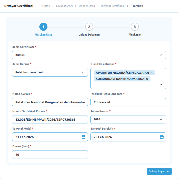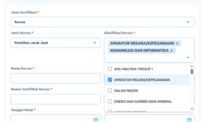 Isi formulir yang disediakan dengan informasi yang akurat dan lengkap sesuai dengan sertifikat pelatihan yang Anda miliki. Untuk Jenis kursus sesuaikan dengan sertifikat yang Anda miliki, apakah Diklat Teknis, Fungsional, Elarning dll. Kemudian pilih klasifikasi kursus, yang berupa rumpun atau tema utama diklat yang diikuti, klasifikasi bisa dipilih lebih dari 1