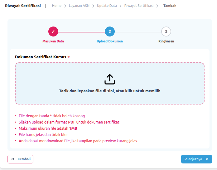 Pastikan untuk mencantumkan detail pelatihan seperti nama diklat, penyelenggara, tanggal pelaksanaan, dan durasi pelatihan dalam hitungan jam. Sertakan juga nomor sertifikat dan klik LANJUTKAN jika semua informasi telah terisi untuk masuk ke langkah selanjutnya.