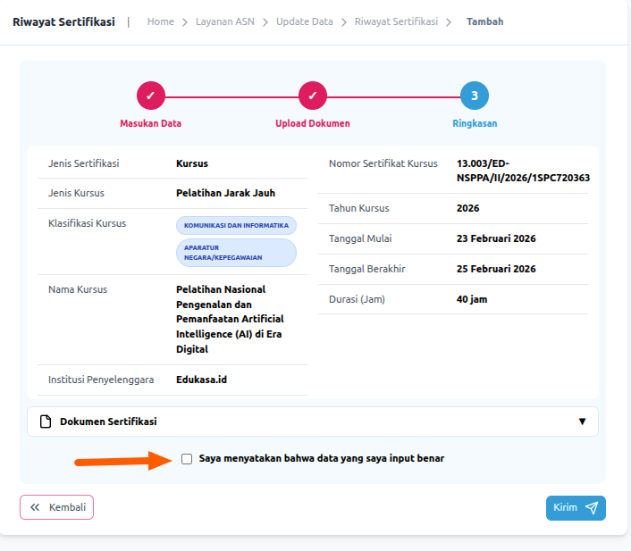 Setelah Anda mengisi semua informasi dengan benar, Lakukan verifikasi ulang untuk memastikan bahwa data riwayat diklat yang Anda masukkan sudah benar dan akurat sebelum menyimpannya. Selanjutnya untuk menyimpan perubahan atau memperbarui data, silahkan centang pada kotak pernyataan seperti pada gambar, kemudian klik KIRIM