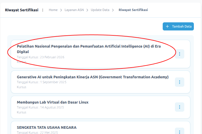 Pada halaman riwayat sertifikat, Anda akan menemukan Daftar Diklat atau Kursus yang sudah diikuti dan di update di MYASN. Jika ada kursus yang belum ada pada daftar, terdapat opsi untuk menambahkan data pelatihan baru seperti pada gambar.